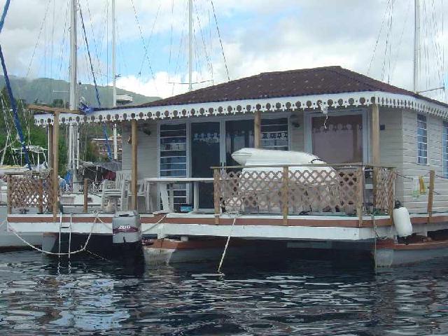 Hausboot mit Außenbordmotor in der Mitte, auf Tahiti, Marina Tahina.
