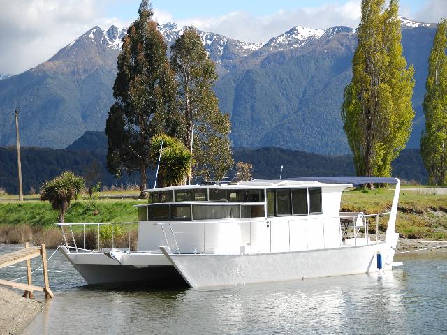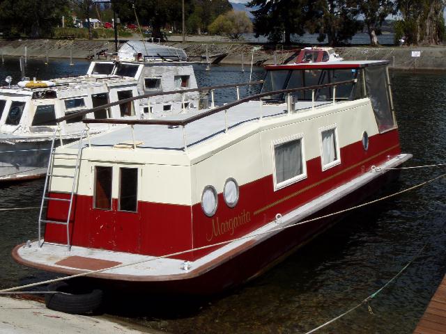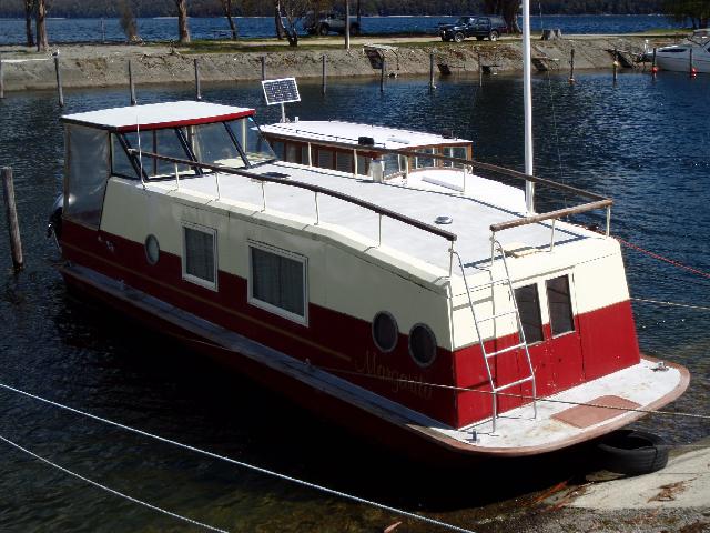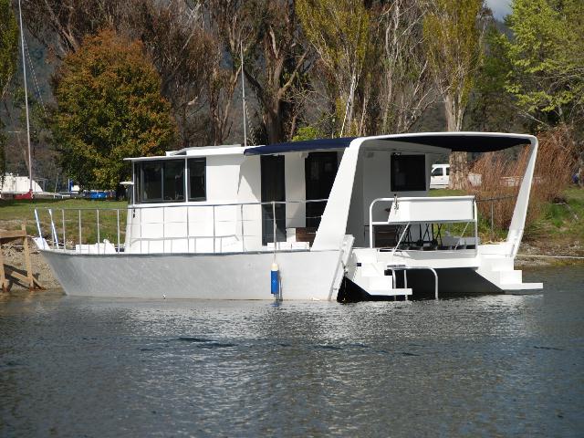 Hausboot in Neuseeland, es ist aus Aluminium und hat einen Motor in der Mitte.