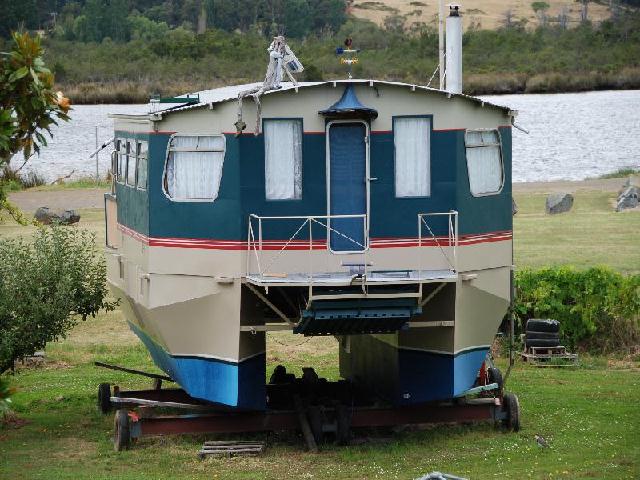 Hier hat sich jemand sein Hausboot aus Stahl zusammen geschweißt, Tasmanien in Franklin.