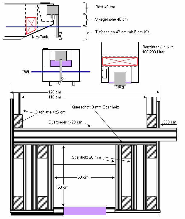 Dieses Bausboot unterscheidet sich auch darin, das es ca. 50 cm in den Rumpf hineingebaut wird. Dadurch habe ich auch weniger Höhe, welches sich bei Hindernissen positiv auswirkt.