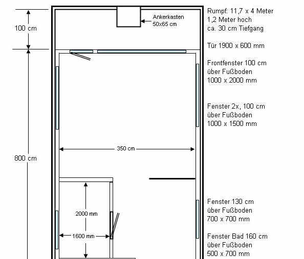 Länge = 11,7 Meter , Breite 4,0 Meter und Höhe über Wasser 3,13 Meter bei einem Tiefgang von ca. 30 cm